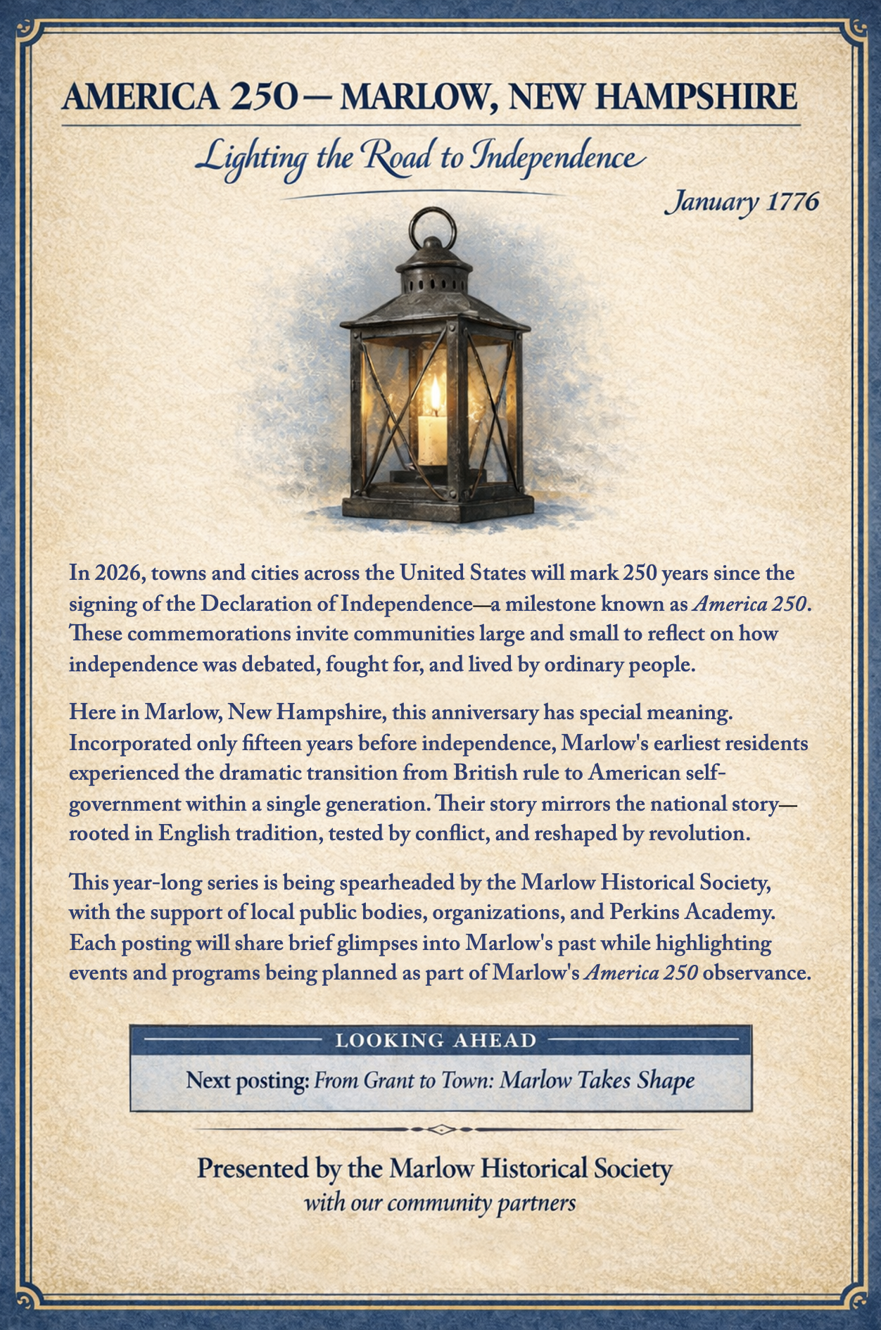 From May to October the Marlow Historical Society Museum is open on the third Sunday of the month 10am to noon, or by appointment. Learn about our collection.